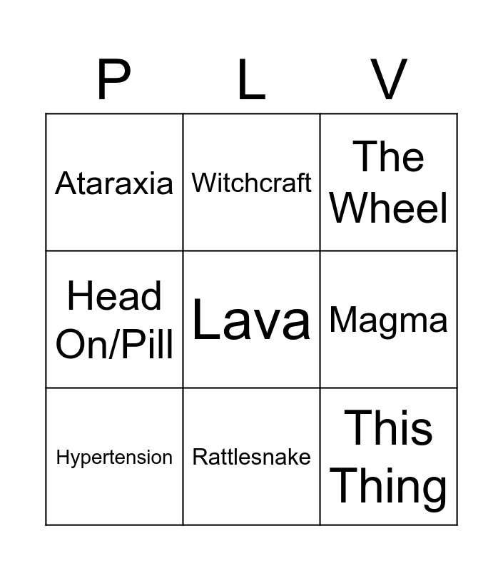 This bingo card has a free space and 8 words: Magma, The Wheel, Witchcraft, Hypertension, Ataraxia, This Thing, Head On/Pill and Rattlesnake.