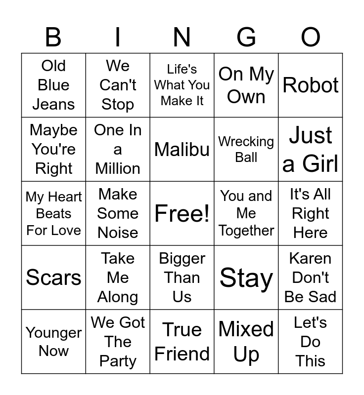 This bingo card has a free space and 30 words: We Got The Party, Nobody's Perfect, Make Some Noise, Rock Star, Old Blue Jeans, Life's What You Make It, One In a Million, Bigger Than Us, You and Me Together, True Friend, It's All Right Here, Let's Do This, Mixed Up, He Could Be the One, Just a Girl, Permanent December, Stay, Scars, Take Me Along, Robot, My Heart Beats For Love, Adore You, We Can't Stop, Wrecking Ball, Maybe You're Right, On My Own, Karen Don't Be Sad, Younger Now, Malibu and Bad Mood.