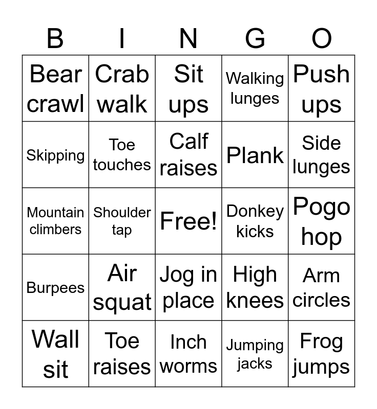 This bingo card has a free space and 24 words: Air squat, Toe raises, Calf raises, Wall sit, Push ups, Bear crawl, Skipping, Crab walk, Donkey kicks, Jog in place, Plank, Mountain climbers, High knees, Arm circles, Toe touches, Jumping jacks, Pogo hop, Sit ups, Side lunges, Shoulder tap, Frog jumps, Burpees, Walking lunges and Inch worms.