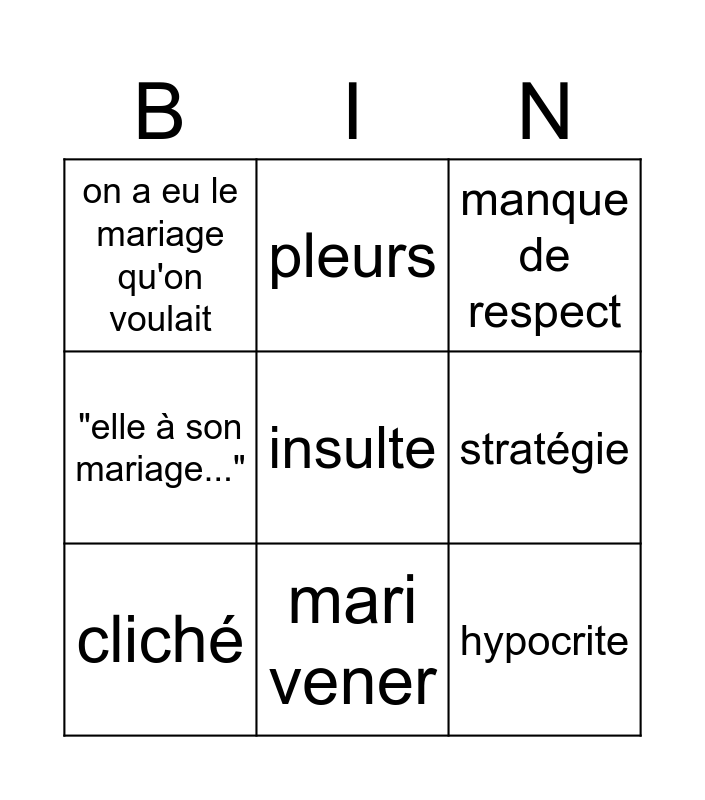 This bingo card has a free space and 8 words: stratégie, manque de respect, pleurs, cliché, on a eu le mariage qu'on voulait, hypocrite, "elle à son mariage..." and mari vener.