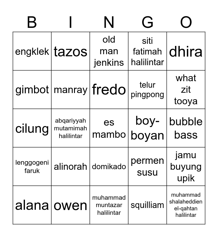 This bingo card has a free space and 24 words: alinorah, owen, fredo, alana, dhira, engklek, gimbot, tazos, boy-boyan, domikado, telur pingpong, cilung, permen susu, jamu buyung upik, manray, squilliam, bubble bass, old man jenkins, what zit tooya, abqariyyah mutamimah halilintar, muhammad shalaheddien el-qahtan halilintar, lenggogeni faruk, siti fatimah halilintar and muhammad muntazar halilintar.