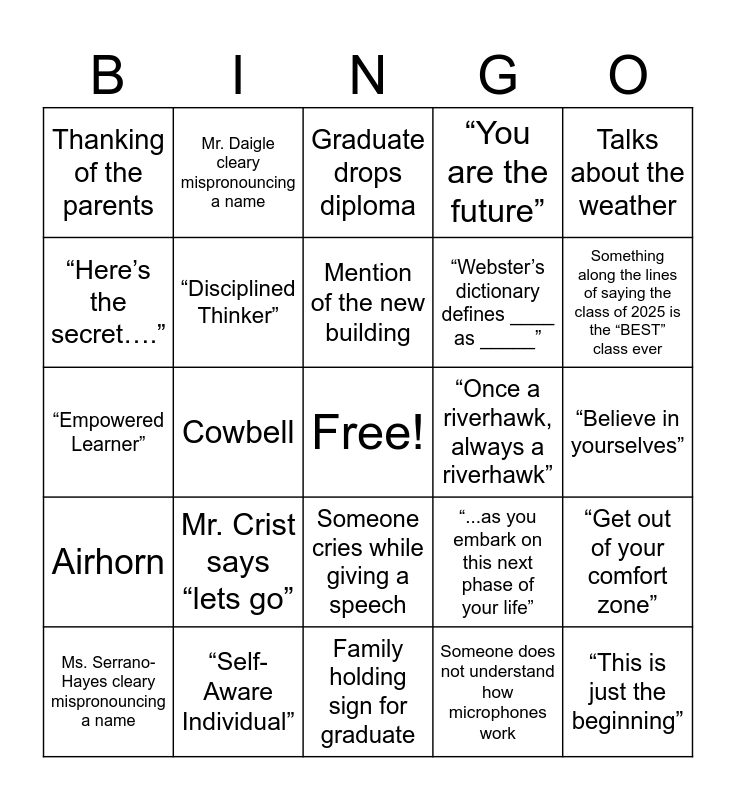 This bingo card has a free space and 41 words: “Civic Minded Contributor”, “Empowered Learner”, “Engaged Collaborator”, “Disciplined Thinker”, “Self-Aware Individual”, Someone cries while giving a speech, Mention of the new building, Someone’s instrument hits a stand, Talks about the weather, Airhorn, Cowbell, “You are the future”, “This is just the beginning”, “Believe in yourselves”, “Once a riverhawk, always a riverhawk”, Mr. Crist says “lets go”, Someone’s wearing crocs, Thanking of the parents, Graduate trips while walking, Graduate drops diploma, “Get out of your comfort zone”, Someone’s phone goes off, Family holding sign for graduate, “Webster’s dictionary defines ____ as _____”, Sports analogy, Mention of the pandemic, Someone does not understand how microphones work, “Good luck”, Something along the lines of saying the class of 2025 is the “BEST” class ever, Graduate is on their phone, Graduate wearing shoes they can’t walk in, Mr. Daigle cleary mispronouncing a name, Ms. Serrano-Hayes cleary mispronouncing a name, Childhood anecdote, “...as you embark on this next phase of your life”, “Here’s the secret….”, Child crying in the audience, Something about being the first class in this building, Mr. Crist talks about “his time” at FHS, Balloon released and A child needs to be chased down.