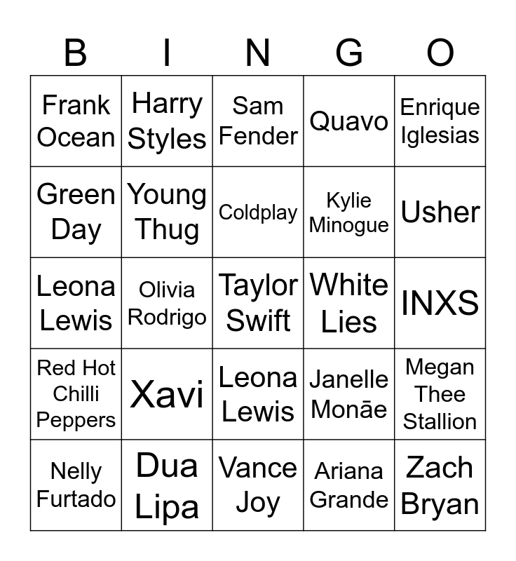 This bingo card has 26 words: Leona Lewis, Ariana Grande, Coldplay, Dua Lipa, Enrique Iglesias, Frank Ocean, Green Day, Harry Styles, INXS, Janelle Monāe, Kylie Minogue, Leona Lewis, Megan Thee Stallion, Nelly Furtado, Olivia Rodrigo, P!nk, Quavo, Red Hot Chilli Peppers, Sam Fender, Taylor Swift, Usher, Vance Joy, White Lies, Xavi, Young Thug and Zach Bryan.