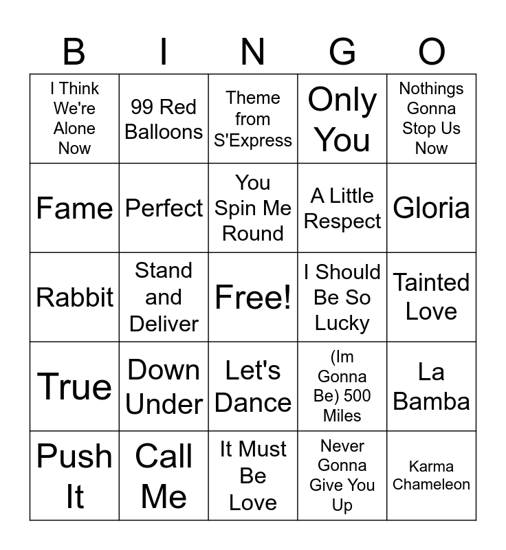 This bingo card has a free space and 51 words: Take On Me, Karma Chameleon, Footloose, It Must Be Love, Down Under, Happy Hour, 99 Red Balloons, Love Shack, Fame, 9 to 5, Perfect, Only You, La Bamba, (Im Gonna Be) 500 Miles, Sweet Dreams, Respectable, You Spin Me Round, I Should Be So Lucky, Neverending Story, Nothings Gonna Stop Us Now, Stand and Deliver, Never Gonna Give You Up, I Think We're Alone Now, A Little Respect, Come On Eileen, When Will I Be Famous, Gloria, Hey Mickey, Push It, Theme from S'Express, Manic Monday, Walk This Way, Hi-Fidelity, Careless Whisper, Don't Stop Believin', Call Me, I'm Still Standing, Don't You Forget About Me, Call Me Al, Making Your Mind Up, Tainted Love, True, I'm So Excited, Like A Virgin, Jump, Girls Just Wanna Have Fun, Rabbit, Venus, Eye of the Tiger, Let's Dance and Lion Sleeps Tonight.