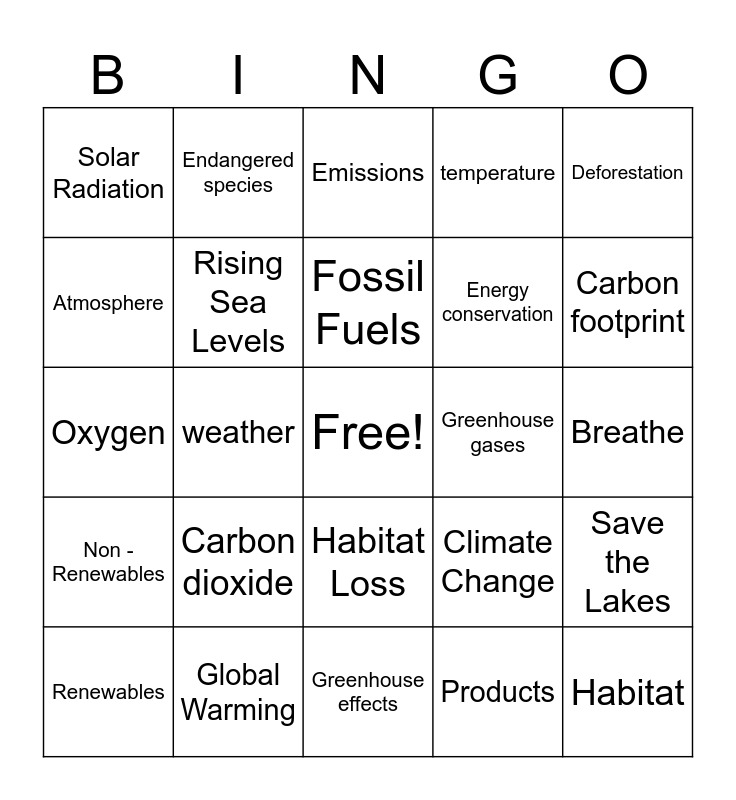 This bingo card has a free space and 24 words: Carbon dioxide, Global Warming, Fossil Fuels, Renewables, Deforestation, Solar Radiation, Atmosphere, Endangered species, Greenhouse gases, Habitat Loss, Energy conservation, Oxygen, Climate Change, Save the Lakes, Rising Sea Levels, Products, Breathe, Emissions, Carbon footprint, weather, Habitat, Non - Renewables, temperature and Greenhouse effects.