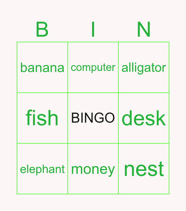 This bingo card has a free space and 8 words: desk, alligator, computer, elephant, banana, nest, fish and money.