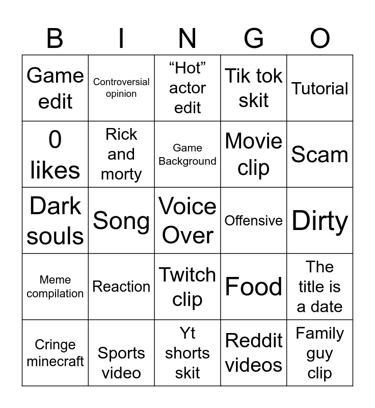 This bingo card has a free space and 24 words: Reaction, Sports video, Game Background, Cringe minecraft, Tutorial, Game edit, 0 likes, Controversial opinion, Offensive, Twitch clip, Movie clip, Dark souls, Food, The title is a date, Rick and morty, Reddit videos, Dirty, “Hot” actor edit, Scam, Song, Family guy clip, Meme compilation, Tik tok skit and Yt shorts skit.
