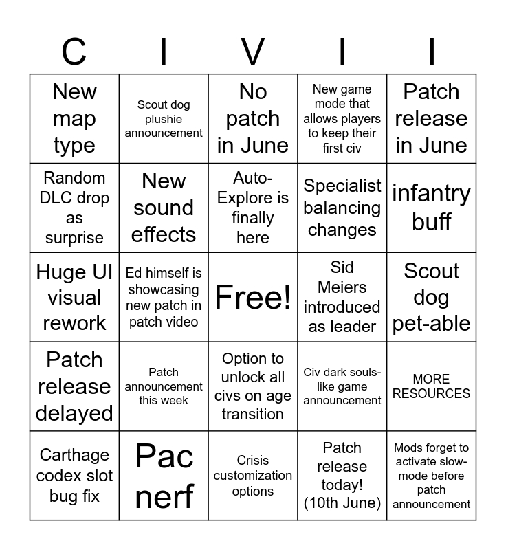 This bingo card has a free space and 24 words: Patch announcement this week, Pac nerf, Auto-Explore is finally here, Carthage codex slot bug fix, Patch release in June, New map type, Random DLC drop as surprise, Scout dog plushie announcement, Sid Meiers introduced as leader, Option to unlock all civs on age transition, Specialist balancing changes, Huge UI visual rework, Civ dark souls-like game announcement, MORE RESOURCES, New sound effects, Patch release today! (10th June), Scout dog pet-able, No patch in June, infantry buff, Ed himself is showcasing new patch in patch video, Mods forget to activate slow-mode before patch announcement, Patch release delayed, New game mode that allows players to keep their first civ and Crisis customization options.