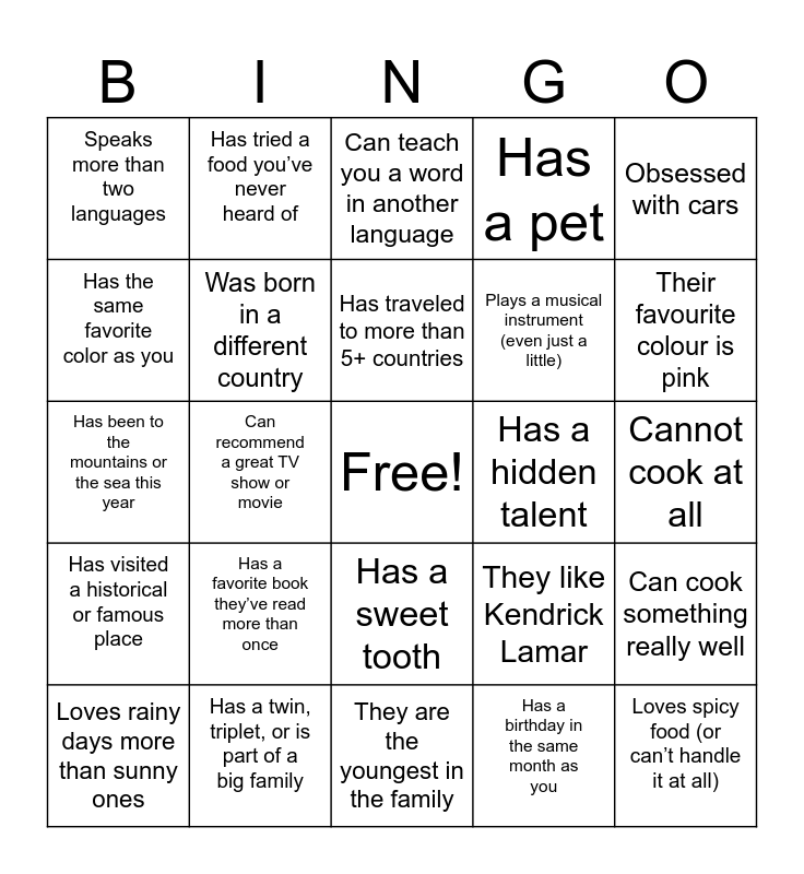 This bingo card has a free space and 24 words: Has a favorite book they’ve read more than once, Has a twin, triplet, or is part of a big family, Has traveled to more than 5+ countries, Loves rainy days more than sunny ones, Obsessed with cars, Speaks more than two languages, Has the same favorite color as you, Has tried a food you’ve never heard of, Has a hidden talent, Has a sweet tooth, Plays a musical instrument (even just a little), Has been to the mountains or the sea this year, They like Kendrick Lamar, Can cook something really well, Was born in a different country, Has a birthday in the same month as you, Cannot cook at all, Can teach you a word in another language, Their favourite colour is pink, Can recommend a great TV show or movie, Loves spicy food (or can’t handle it at all), Has visited a historical or famous place, Has a pet and They are the youngest in the family.