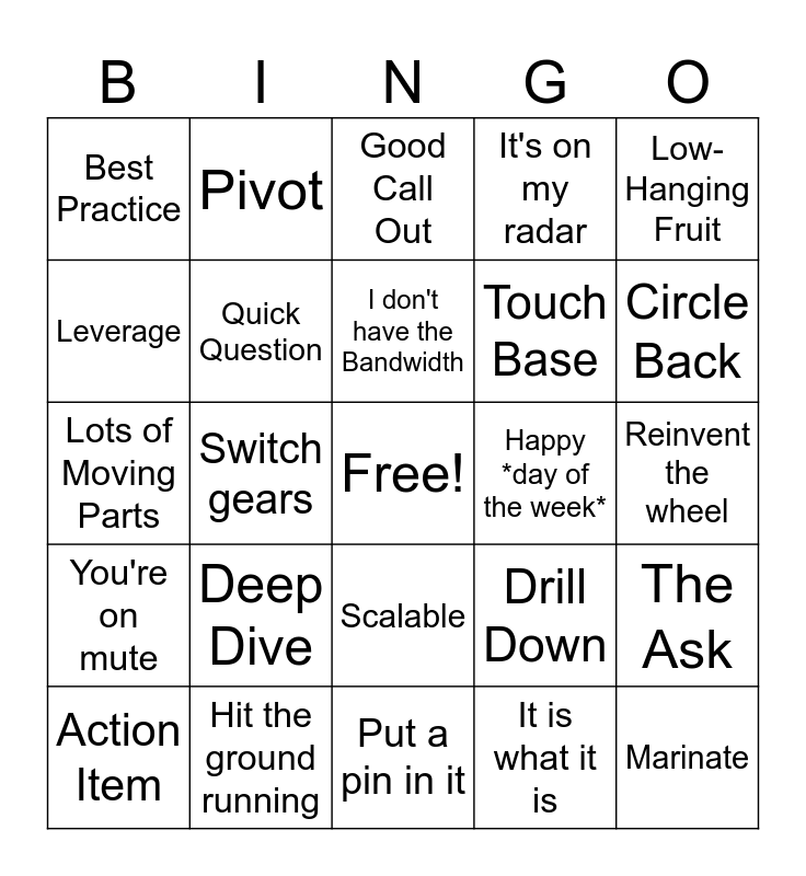 This bingo card has a free space and 24 words: Deep Dive, Hit the ground running, I don't have the Bandwidth, Action Item, Low-Hanging Fruit, Best Practice, Leverage, Pivot, Happy *day of the week*, Scalable, Touch Base, Lots of Moving Parts, Drill Down, The Ask, Quick Question, It is what it is, Reinvent the wheel, Good Call Out, Circle Back, Switch gears, Marinate, You're on mute, It's on my radar and Put a pin in it.
