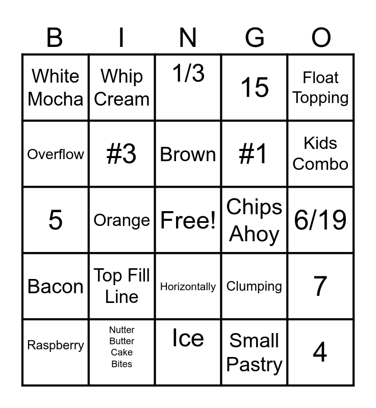 This bingo card has a free space and 24 words: Raspberry, Top Fill Line, Brown, Small Pastry, Float Topping, White Mocha, Whip Cream, 1/3, Chips Ahoy, 6/19, 5, #3, Clumping, 7, Overflow, Nutter Butter Cake Bites, Ice, 15, Kids Combo, Bacon, Orange, Horizontally, #1 and 4.