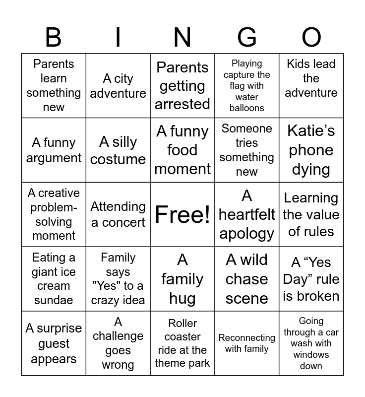 This bingo card has a free space and 24 words: Family says "Yes" to a crazy idea, A challenge goes wrong, A funny food moment, A surprise guest appears, Kids lead the adventure, Parents learn something new, A funny argument, A city adventure, A heartfelt apology, A family hug, Someone tries something new, A creative problem-solving moment, A wild chase scene, A “Yes Day” rule is broken, A silly costume, Reconnecting with family, Learning the value of rules, Parents getting arrested, Katie’s phone dying, Attending a concert, Going through a car wash with windows down, Eating a giant ice cream sundae, Playing capture the flag with water balloons and Roller coaster ride at the theme park.