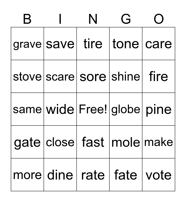 This bingo card has a free space and 24 words: close, dine, sore, more, care, grave, stove, save, globe, fast, shine, same, mole, make, scare, fate, pine, tire, fire, wide, vote, gate, tone and rate.