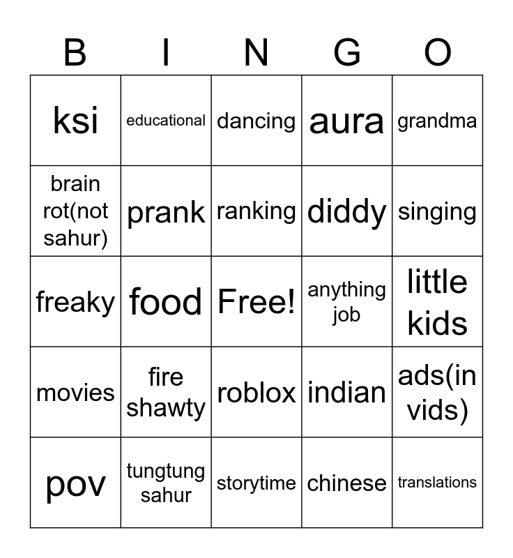 This bingo card has a free space and 24 words: fire shawty, tungtung sahur, ranking, pov, grandma, ksi, brain rot(not sahur), educational, anything job, roblox, diddy, freaky, indian, ads(in vids), prank, chinese, little kids, dancing, singing, food, translations, movies, aura and storytime.