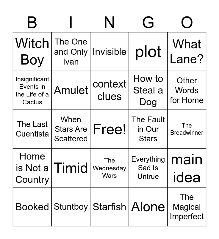 This bingo card has a free space and 29 words: Booked, Allergic, When Stars Are Scattered, Girl from the Sea, Witch Boy, Invisible, Amulet, Timid, The Fault in Our Stars, Stuntboy, The Breadwinner, The Magical Imperfect, Starfish, Alone, Other Words for Home, The Crossover, The Wednesday Wars, Home is Not a Country, What Lane?, The Last Cuentista, Everything Sad Is Untrue, summary, How to Steal a Dog, Insignificant Events in the Life of a Cactus, plot, The One and Only Ivan, main idea, context clues and inference.