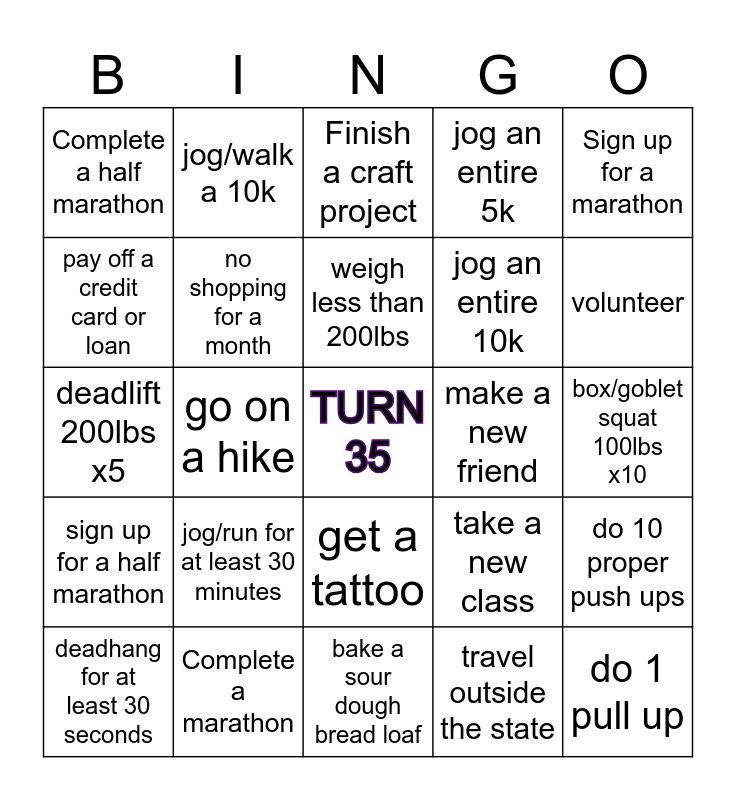 This bingo card has a free space and 24 words: jog/run for at least 30 minutes, Complete a marathon, weigh less than 200lbs, deadhang for at least 30 seconds, Sign up for a marathon, Complete a half marathon, pay off a credit card or loan, jog/walk a 10k, make a new friend, get a tattoo, jog an entire 10k, deadlift 200lbs x5, take a new class, do 10 proper push ups, no shopping for a month, travel outside the state, box/goblet squat 100lbs x10, Finish a craft project, volunteer, go on a hike, do 1 pull up, sign up for a half marathon, jog an entire 5k and bake a sour dough bread loaf.