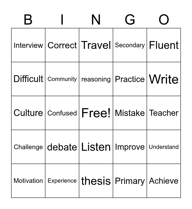 This bingo card has a free space and 25 words: debate, thesis, reasoning, Motivation, Fluent, Interview, Difficult, Correct, Mistake, Listen, Practice, Culture, Improve, Understand, Community, Homework, Teacher, Travel, Write, Confused, Achieve, Experience, Challenge, Secondary and Primary.