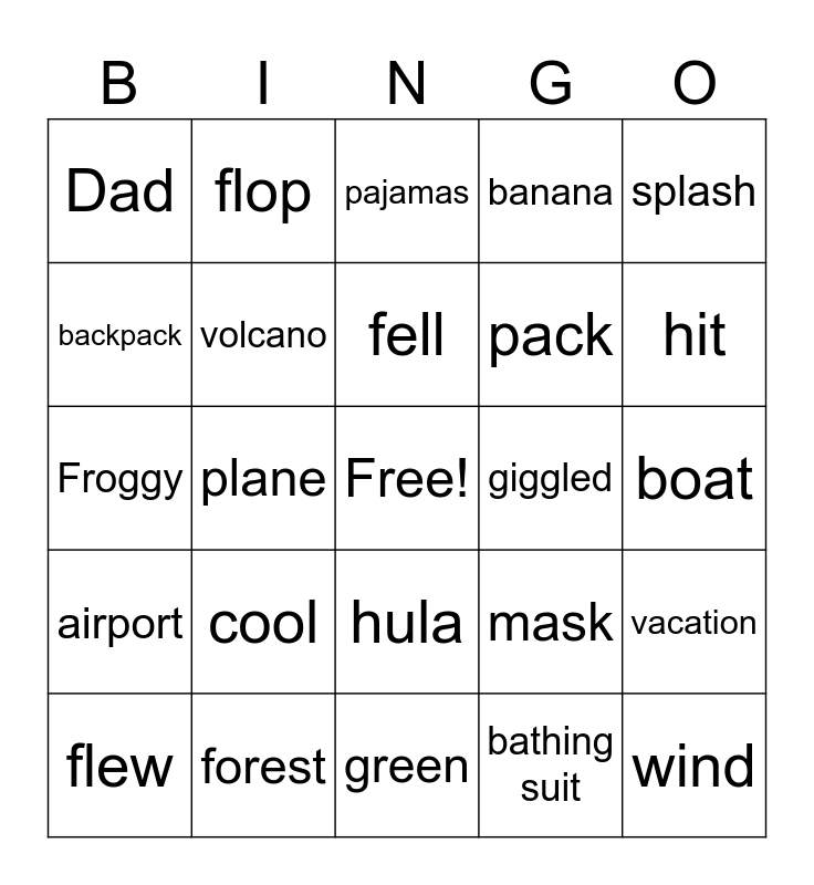 This bingo card has a free space and 28 words: vacation, Hawaii, pack, bathing suit, backpack, pajamas, flop, airport, giggled, flew, Froggy, banana, forest, green, hit, hot, cool, volcano, fell, hula, Dad, surfed, wind, plane, boat, mask, splash and home.