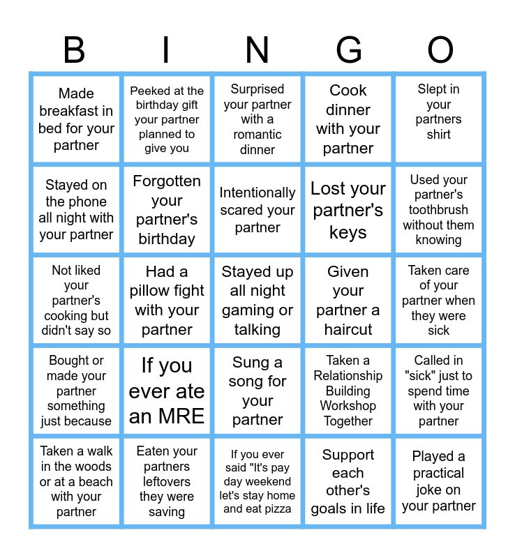 This bingo card has 25 words: If you ever ate an MRE, If you ever said "It's pay day weekend let's stay home and eat pizza, Intentionally scared your partner, Taken a walk in the woods or at a beach with your partner, Slept in your partners shirt, Made breakfast in bed for your partner, Stayed on the phone all night with your partner, Peeked at the birthday gift your partner planned to give you, Given your partner a haircut, Sung a song for your partner, Lost your partner's keys, Not liked your partner's cooking but didn't say so, Taken a Relationship Building Workshop Together, Called in "sick" just to spend time with your partner, Forgotten your partner's birthday, Played a practical joke on your partner, Taken care of your partner when they were sick, Surprised your partner with a romantic dinner, Used your partner's toothbrush without them knowing, Had a pillow fight with your partner, Stayed up all night gaming or talking, Eaten your partners leftovers they were saving, Bought or made your partner something just because, Cook dinner with your partner and Support each other's goals in life.