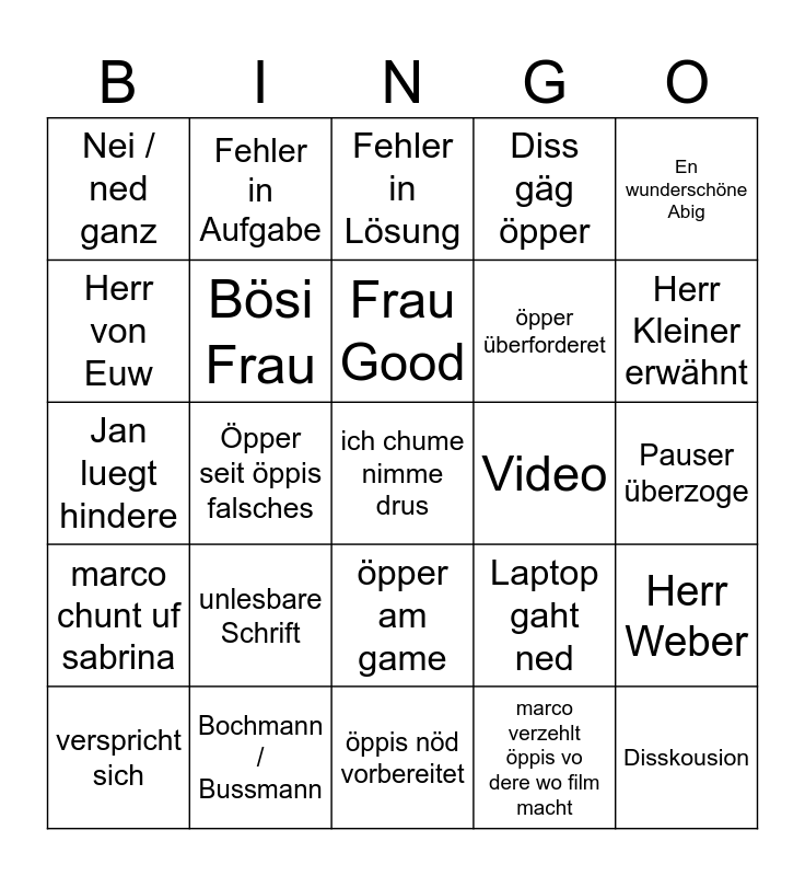 This bingo card has a free space and 24 words: unlesbare Schrift, Bochmann / Bussmann, Frau Good, verspricht sich, En wunderschöne Abig, Nei / ned ganz, Herr von Euw, Fehler in Aufgabe, Video, öpper am game, öpper überforderet, Jan luegt hindere, Laptop gaht ned, Herr Weber, Bösi Frau, marco verzehlt öppis vo dere wo film macht, Pauser überzoge, Fehler in Lösung, Herr Kleiner erwähnt, Öpper seit öppis falsches, Disskousion, marco chunt uf sabrina, Diss gäg öpper and öppis nöd vorbereitet.