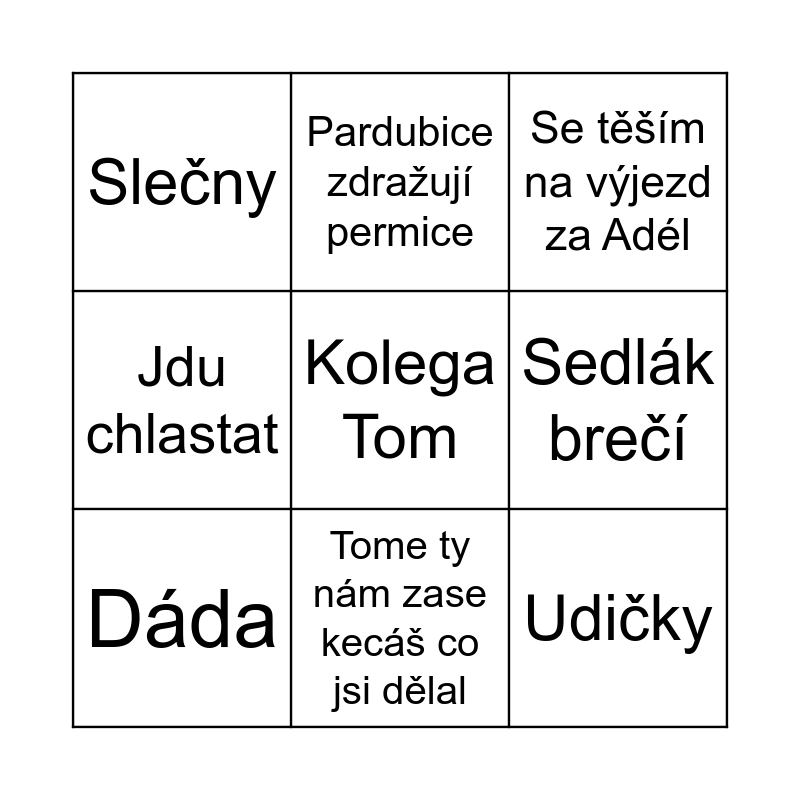 This bingo card has a free space and 8 words: Sedlák brečí, Se těším na výjezd za Adél, Pardubice zdražují permice, Dáda, Slečny, Udičky, Jdu chlastat and Tome ty nám zase kecáš co jsi dělal.