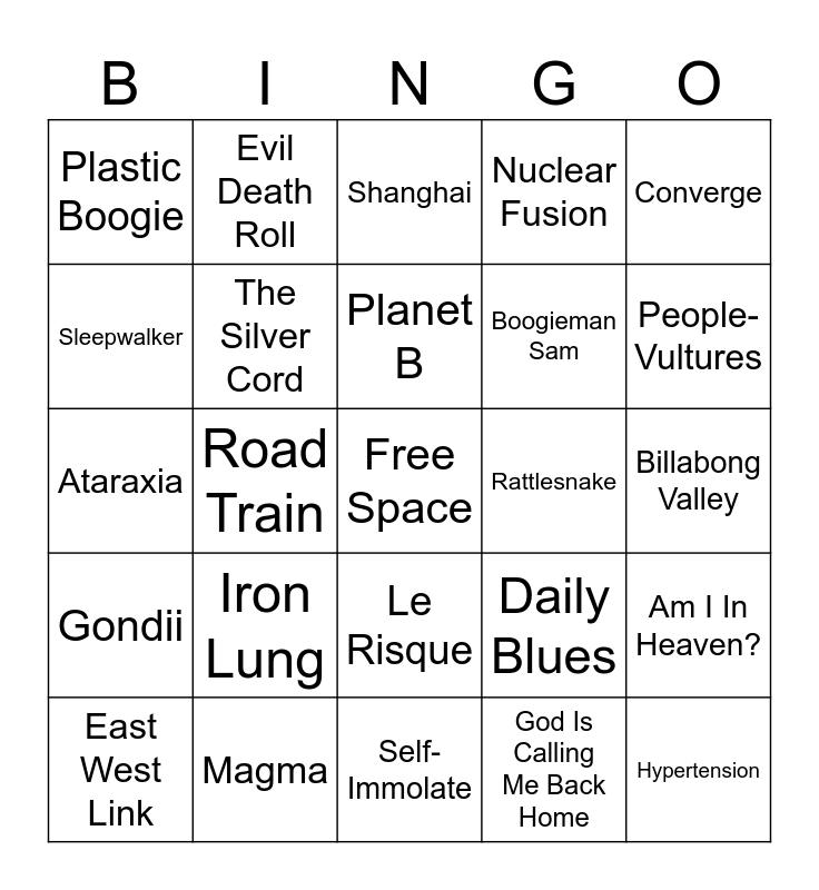 This bingo card has a free space and 24 words: Iron Lung, Magma, Planet B, East West Link, Converge, Plastic Boogie, Sleepwalker, Evil Death Roll, Rattlesnake, Le Risque, Boogieman Sam, Ataraxia, Daily Blues, Am I In Heaven?, The Silver Cord, God Is Calling Me Back Home, Billabong Valley, Shanghai, People-Vultures, Road Train, Hypertension, Gondii, Nuclear Fusion and Self-Immolate.