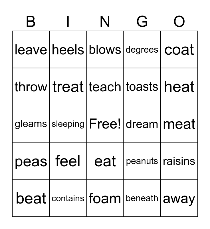 This bingo card has a free space and 45 words: always, away, beans, beat, below, beneath, blows, cheese, coat, contains, degrees, dream, eat, feel, feet, foam, freeze, gleams, grains, heat, heels, holiday, keep, leave, meals, meat, needs, painful, peanuts, peas, rain, raisins, sealed, see, sleep, sleeping, snow, sweet, tea, teach, throw, toasts, trails, treat and unseal.