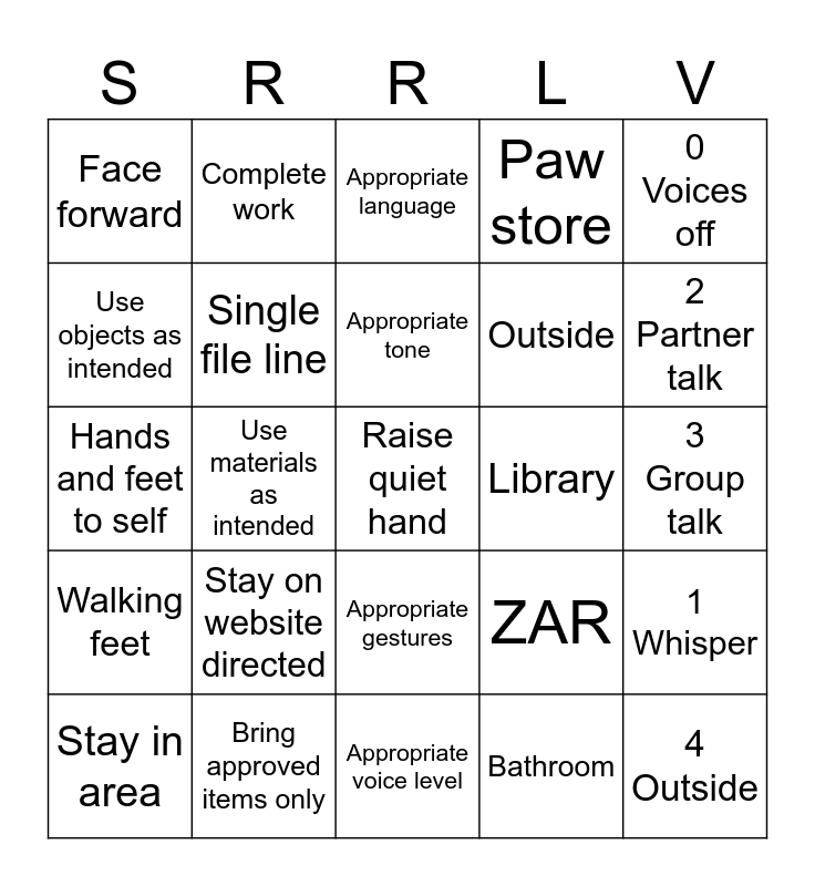 This bingo card has 25 words: Walking feet, Bring approved items only, Raise quiet hand, Bathroom, 0 Voices off, Face forward, Complete work, Appropriate language, Library, 1 Whisper, Use objects as intended, Single file line, Appropriate voice level, ZAR, 2 Partner talk, Stay in area, Use materials as intended, Appropriate tone, Outside, 3 Group talk, Hands and feet to self, Stay on website directed, Appropriate gestures, Paw store and 4 Outside.