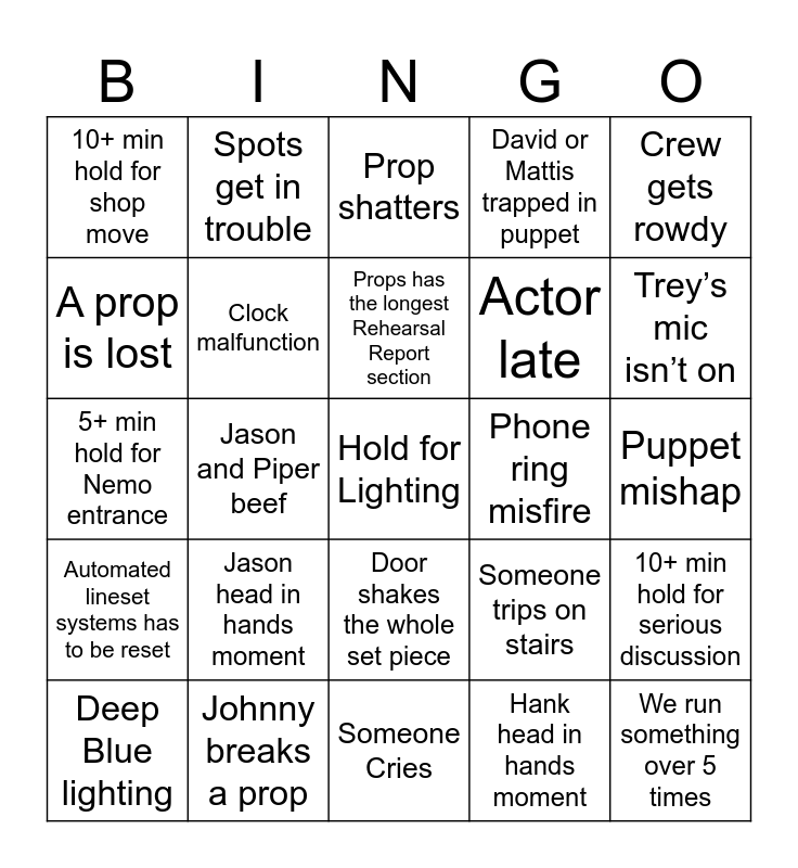 This bingo card has a free space and 31 words: Someone Cries, Hank gets heated, Jason and Piper beef, 10+ min hold for puppet, 10+ min hold for shop move, Prop shatters, Clock malfunction, Someone trips on stairs, Phone ring misfire, Hank head in hands moment, Puppet mishap, We run something over 5 times, Platform wiggles, Mic Feedback, Trey’s mic isn’t on, Band isn’t audible, 10+ min hold for serious discussion, Jason head in hands moment, Automated lineset systems has to be reset, Door shakes the whole set piece, Crew gets rowdy, Major re-block, Deep Blue lighting, Spots get in trouble, Actor late, A prop is lost, David or Mattis trapped in puppet, 5+ min hold for Nemo entrance, Johnny breaks a prop, Props has the longest Rehearsal Report section and Callback in the morning run x3.