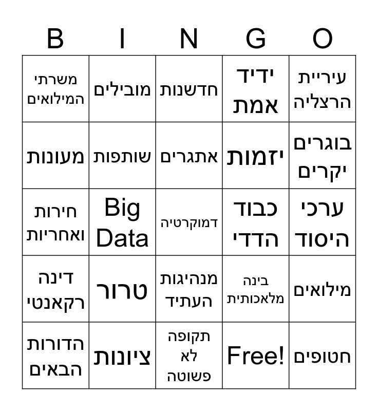 This bingo card has 32 words: Free!, דוקטורט, Big Data, מדעי המח, דינה רקאנטי, שותפות, עיריית הרצליה, מילואים, מובילים, חטופים, אתגרים, חדשנות, מציב אותנו בשורה הראשונה, יוצא מן הכלל, כבוד הדדי, שאלות קשות, הדורות הבאים, חירות ואחריות, מנהיגות העתיד, טרור, בינה מלאכותית, AI, ערכי היסוד, ציונות, דמוקרטיה, ידיד אמת, יזמות, מעונות, משרתי המילואים, תקופה לא פשוטה, היום אתם and בוגרים יקרים.