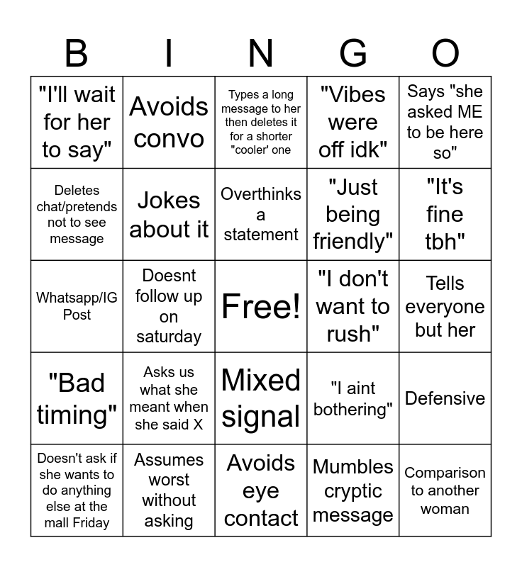 This bingo card has a free space and 24 words: Doesn't ask if she wants to do anything else at the mall Friday, Asks us what she meant when she said X, Overthinks a statement, Mumbles cryptic message, Says "she asked ME to be here so", "I'll wait for her to say", Avoids convo, Types a long message to her then deletes it for a shorter "cooler' one, "I don't want to rush", Tells everyone but her, Whatsapp/IG Post, Jokes about it, "I aint bothering", Defensive, Deletes chat/pretends not to see message, Assumes worst without asking, Avoids eye contact, "Vibes were off idk", "It's fine tbh", "Bad timing", Doesnt follow up on saturday, Mixed signal, "Just being friendly" and Comparison to another woman.