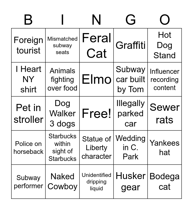 This bingo card has a free space and 24 words: Starbucks within sight of Starbucks, Naked Cowboy, Elmo, Subway performer, Hot Dog Stand, Foreign tourist, I Heart NY shirt, Mismatched subway seats, Illegally parked car, Statue of Liberty character, Subway car built by Tom, Pet in stroller, Wedding in C. Park, Yankees hat, Animals fighting over food, Husker gear, Sewer rats, Feral Cat, Influencer recording content, Dog Walker 3 dogs, Bodega cat, Police on horseback, Graffiti and Unidentified dripping liquid.