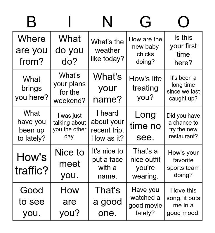 This bingo card has a free space and 24 words: Nice to meet you., How are you?, What's your name?, Good to see you., Is this your first time here?, Where are you from?, What brings you here?, What do you do?, Long time no see., It's nice to put a face with a name., How's life treating you?, What have you been up to lately?, That's a nice outfit you're wearing., How's your favorite sports team doing?, What's your plans for the weekend?, Have you watched a good movie lately?, Did you have a chance to try the new restaurant?, What's the weather like today?, It's been a long time since we last caught up?, I was just talking about you the other day., I love this song, it puts me in a good mood., How's traffic?, How are the new baby chicks doing? and That's a good one..