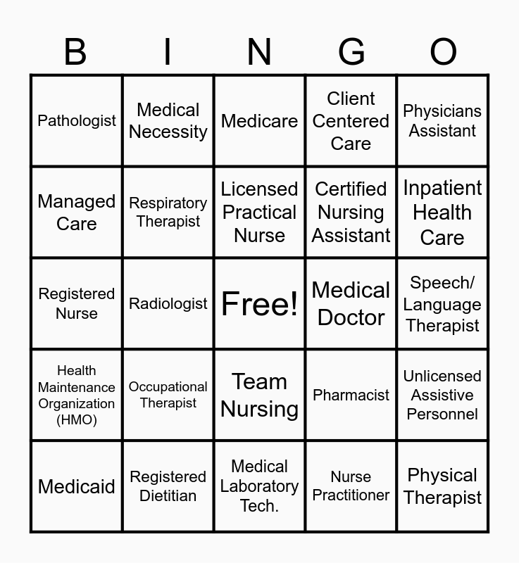 This bingo card has a free space and 29 words: Out Patient Health Care, Registered Dietitian, Medicare, Medical Social Worker, Physicians Assistant, Pathologist, Respiratory Therapist, Licensed Practical Nurse, Medical Doctor, Unlicensed Assistive Personnel, Medicaid, Radiologist, Nurse Practitioner, Physical Therapist, Registered Nurse, Chaplin, Medical Laboratory Tech., Pharmacist, Inpatient Health Care, Health Maintenance Organization (HMO), Occupational Therapist, Self-pay, Certified Nursing Assistant, Speech/ Language Therapist, Managed Care, Medical Necessity, Team Nursing, Client Centered Care and Primary Care Nursing.