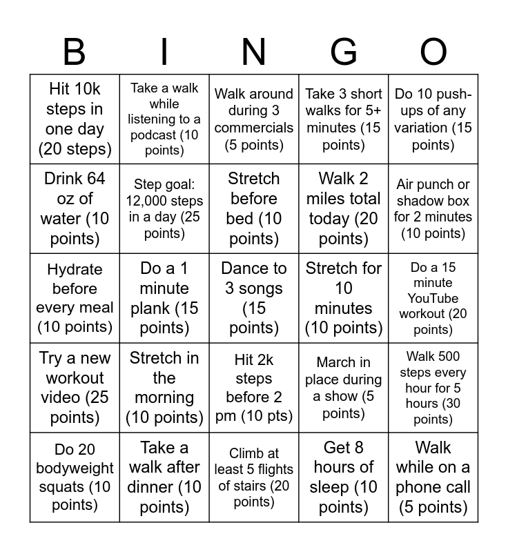 This bingo card has 25 words: Stretch in the morning (10 points), Climb at least 5 flights of stairs (20 points), Stretch before bed (10 points), Do 20 bodyweight squats (10 points), Do 10 push-ups of any variation (15 points), Hit 10k steps in one day (20 steps), Drink 64 oz of water (10 points), Take a walk while listening to a podcast (10 points), Stretch for 10 minutes (10 points), Hit 2k steps before 2 pm (10 pts), Walk 2 miles total today (20 points), Hydrate before every meal (10 points), March in place during a show (5 points), Walk 500 steps every hour for 5 hours (30 points), Step goal: 12,000 steps in a day (25 points), Walk while on a phone call (5 points), Do a 15 minute YouTube workout (20 points), Walk around during 3 commercials (5 points), Air punch or shadow box for 2 minutes (10 points), Do a 1 minute plank (15 points), Dance to 3 songs (15 points), Take a walk after dinner (10 points), Try a new workout video (25 points), Take 3 short walks for 5+ minutes (15 points) and Get 8 hours of sleep (10 points).