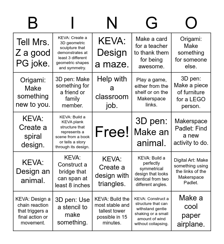 This bingo card has a free space and 24 words: KEVA: Construct a bridge that can span at least 8 inches, 3D pen: Use a stencil to make something., Help with a classroom job., KEVA: Design a chain reaction that triggers a final action or movement., Origami: Make something for someone else., Tell Mrs. Z a good PG joke., Origami: Make something new to you., KEVA: Create a 3D geometric sculpture that demonstrates at least 3 different geometric shapes and symmetry., 3D pen: Make an animal., KEVA: Create a design with triangles., Play a game, either from the shelf or on the Makerspace links., KEVA: Create a spiral design., KEVA: Build a perfectly symmetrical design that looks identical from two different angles., Digital Art: Make something using the links of the Makerspace Padlet., 3D pen: Make something for a friend or family member., KEVA: Construct a structure that can withstand gentle shaking or a small amount of wind without collapsing., Makerspace Padlet: Find a new activity to do., KEVA: Design a maze., 3D pen: Make a piece of furniture for a LEGO person., KEVA: Build a KEVA plank structure that represents a scene from a book or tells a story through its design., Make a cool paper airplane., KEVA: Design an animal., Make a card for a teacher to thank them for being awesome. and KEVA: Build the most stable and tallest tower possible in 15 minutes..
