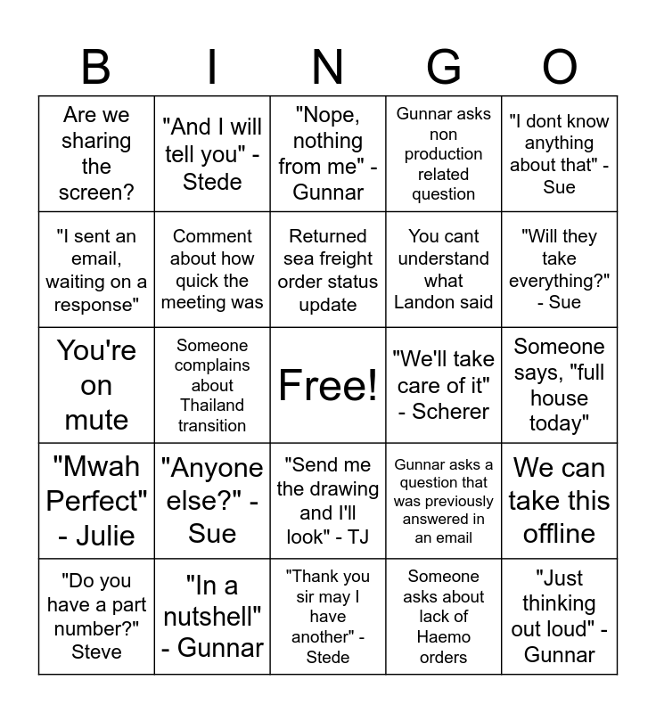 This bingo card has a free space and 24 words: "Anyone else?" - Sue, "In a nutshell" - Gunnar, Returned sea freight order status update, "Do you have a part number?" Steve, "I dont know anything about that" - Sue, Are we sharing the screen?, "I sent an email, waiting on a response", "And I will tell you" - Stede, "We'll take care of it" - Scherer, "Send me the drawing and I'll look" - TJ, You cant understand what Landon said, You're on mute, Gunnar asks a question that was previously answered in an email, We can take this offline, Comment about how quick the meeting was, Someone asks about lack of Haemo orders, Someone says, "full house today", "Nope, nothing from me" - Gunnar, "Will they take everything?" - Sue, Someone complains about Thailand transition, "Just thinking out loud" - Gunnar, "Mwah Perfect" - Julie, Gunnar asks non production related question and "Thank you sir may I have another" -Stede.