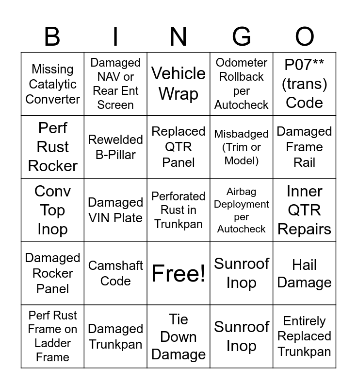 This bingo card has 26 words: Free!, Sunroof Inop, Replaced QTR Panel, Damaged Trunkpan, P07** (trans) Code, Missing Catalytic Converter, Perf Rust Rocker, Damaged NAV or Rear Ent Screen, Inner QTR Repairs, Sunroof Inop, Misbadged (Trim or Model), Conv Top Inop, Hail Damage, Perf Rust Frame on Ladder Frame, Damaged VIN Plate, Sunroof Inop, Odometer Rollback per Autocheck, Damaged Rocker Panel, Vehicle Wrap, Perforated Rust in Trunkpan, Damaged Frame Rail, Tie Down Damage, Airbag Deployment per Autocheck, Camshaft Code, Rewelded B-Pillar and Entirely Replaced Trunkpan.