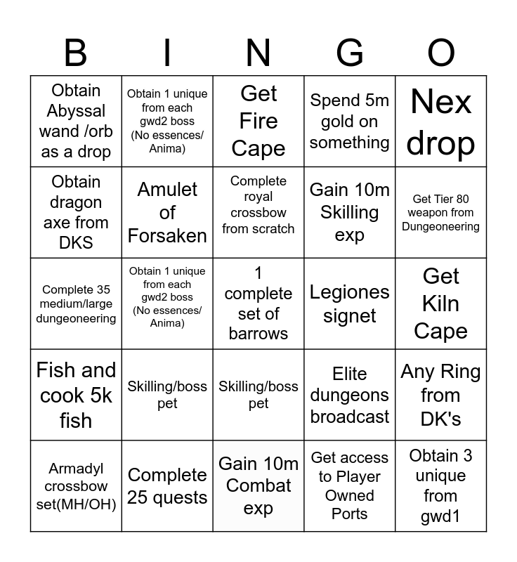 This bingo card has 25 words: Skilling/boss pet, Gain 10m Combat exp, Complete royal crossbow from scratch, Armadyl crossbow set(MH/OH), Nex drop, Obtain Abyssal wand /orb as a drop, Obtain dragon axe from DKS, Obtain 1 unique from each gwd2 boss (No essences/ Anima), Legiones signet, Skilling/boss pet, Gain 10m Skilling exp, Complete 35 medium/large dungeoneering, Elite dungeons broadcast, Any Ring from DK's, Amulet of Forsaken, Obtain 3 unique from gwd1, Get Kiln Cape, Get Fire Cape, Get Tier 80 weapon from Dungeoneering, Obtain 1 unique from each gwd2 boss (No essences/ Anima), 1 complete set of barrows, Complete 25 quests, Fish and cook 5k fish, Spend 5m gold on something and Get access to Player Owned Ports.