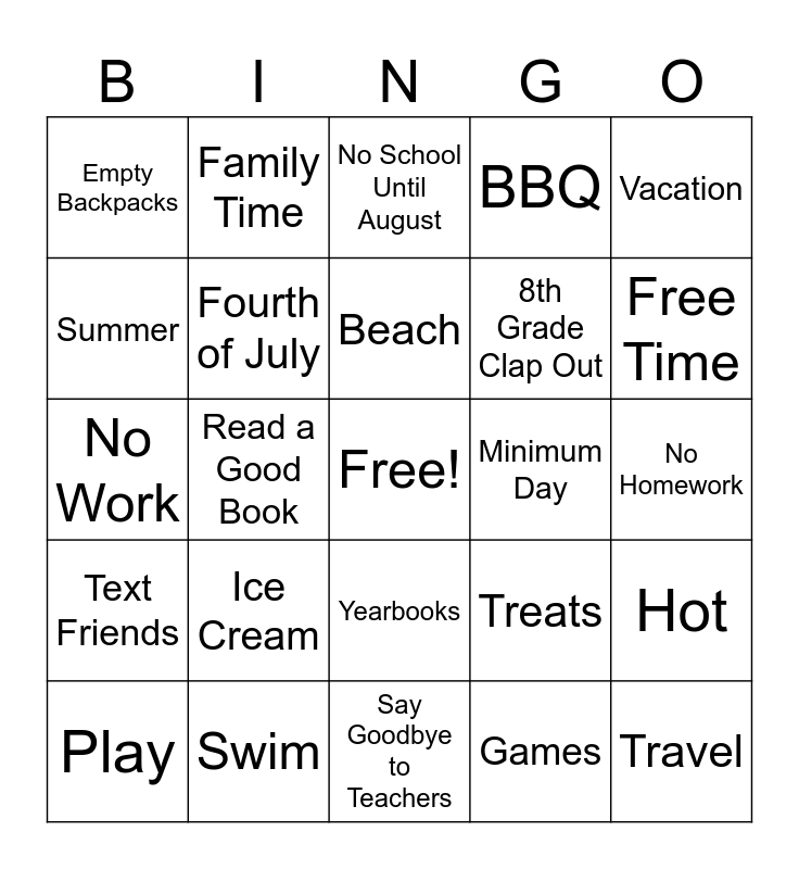 This bingo card has a free space and 24 words: Ice Cream, Swim, Beach, Play, Vacation, Empty Backpacks, Summer, Family Time, Minimum Day, Yearbooks, 8th Grade Clap Out, No Work, Treats, Hot, Fourth of July, Games, No Homework, No School Until August, Free Time, Read a Good Book, Travel, Text Friends, BBQ and Say Goodbye to Teachers.