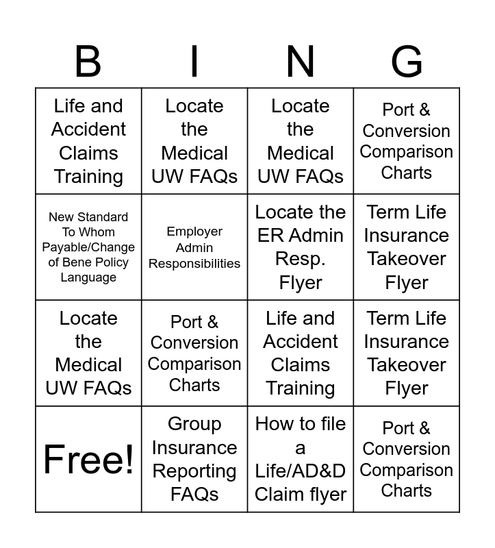 This bingo card has 23 words: Port & Conversion Comparison Charts, How to file a Life/AD&D Claim flyer, Term Life Insurance Takeover Flyer, Locate the Term Life Insurance Product FAQs, New Standard To Whom Payable/Change of Bene Policy Language, Life and Accident Claims Training, Employer Admin Responsibilities, Locate the Medical UW FAQs, Free!, FAQs for Death Claim Files, Port & Conversion Comparison Charts, Locate the Medical UW FAQs, Life and Accident Claims Training, Employer Admin Responsibilities, Group Insurance Reporting FAQs, Port & Conversion Comparison Charts, Locate the Medical UW FAQs, Life and Accident Claims Training, Locate the ER Admin Resp. Flyer, Term Life Insurance Takeover Flyer, Port & Conversion Comparison Charts, How to file a Life/AD&D Claim flyer and Locate the Term Life Insurance Product FAQs.