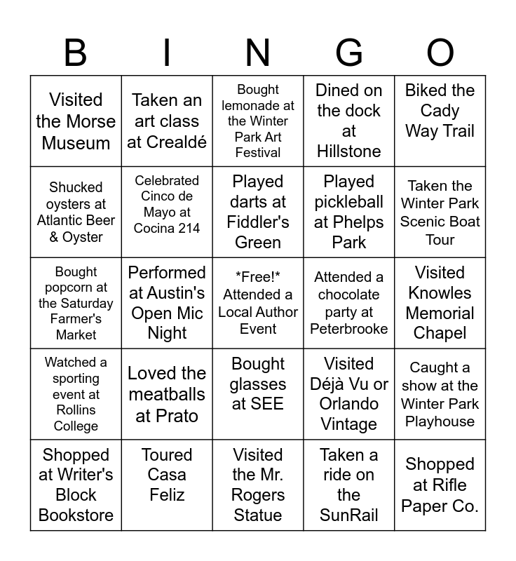This bingo card has a free space and 24 words: Loved the meatballs at Prato, Toured Casa Feliz, Played darts at Fiddler's Green, Shopped at Writer's Block Bookstore, Biked the Cady Way Trail, Visited the Morse Museum, Shucked oysters at Atlantic Beer & Oyster, Taken an art class at Crealdé, Attended a chocolate party at Peterbrooke, Bought glasses at SEE, Played pickleball at Phelps Park, Bought popcorn at the Saturday Farmer's Market, Visited Déjà Vu or Orlando Vintage, Caught a show at the Winter Park Playhouse, Celebrated Cinco de Mayo at Cocina 214, Taken a ride on the SunRail, Visited Knowles Memorial Chapel, Bought lemonade at the Winter Park Art Festival, Taken the Winter Park Scenic Boat Tour, Performed at Austin's Open Mic Night, Shopped at Rifle Paper Co., Watched a sporting event at Rollins College, Dined on the dock at Hillstone and Visited the Mr. Rogers Statue.