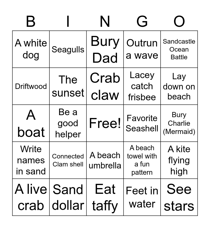 This bingo card has a free space and 24 words: Connected Clam shell, Sand dollar, Crab claw, A live crab, Sandcastle Ocean Battle, A white dog, Driftwood, Seagulls, Favorite Seashell, A beach umbrella, Lacey catch frisbee, A boat, A beach towel with a fun pattern, A kite flying high, The sunset, Feet in water, Bury Charlie (Mermaid), Bury Dad, Lay down on beach, Be a good helper, See stars, Write names in sand, Outrun a wave and Eat taffy.