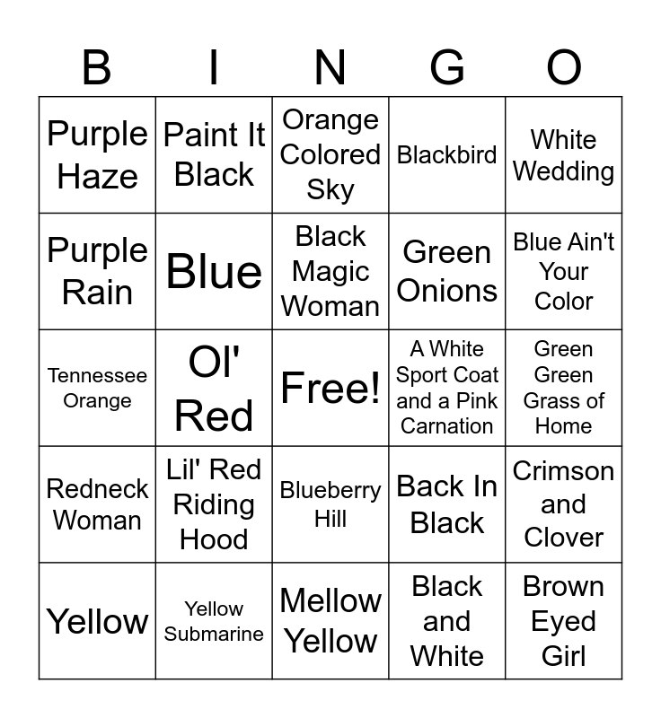 This bingo card has a free space and 54 words: Red Red Wine, Redneck Woman, Courtesy of the Red White & Blue, Blue Moon of Kentucky, Blueberry Hill, Black Betty, Blackbird, Black Velvet, Purple Rain, The Purple People Eater, Purple Haze, Pink Panther Theme, Yellow Submarine, Yellow, Goodbye Yellow Brick Road, Mellow Yellow, Brown Eyed Girl, Green Onions, Green River, Green Green Grass of Home, Back In Black, Blue Velvet, A White Sport Coat and a Pink Carnation, White Wedding, Black Is Black, Paint It Black, Back to Black, White and Nerdy, I Guess That's Why They Call It the Blues, Black and White, Blue Suede Shoes, Long Cool Woman in a Black Dress, Blue Moon, Something in the Orange, Orange Colored Sky, Orange Crush, Tennessee Orange, Crimson and Clover, Black Horse and the Cherry Tree, Blue, White Line Fever, Crystal Blue Persuasion, Blue Monday, Tie a Yellow Ribbon Around the Old Oak Tree, Lil' Red Riding Hood, Little Red Corvette, Man In Black, Band of Gold, Black Magic Woman, Ol' Red, Blue Ain't Your Color, Little White Church, White Liar and Charlie Brown.