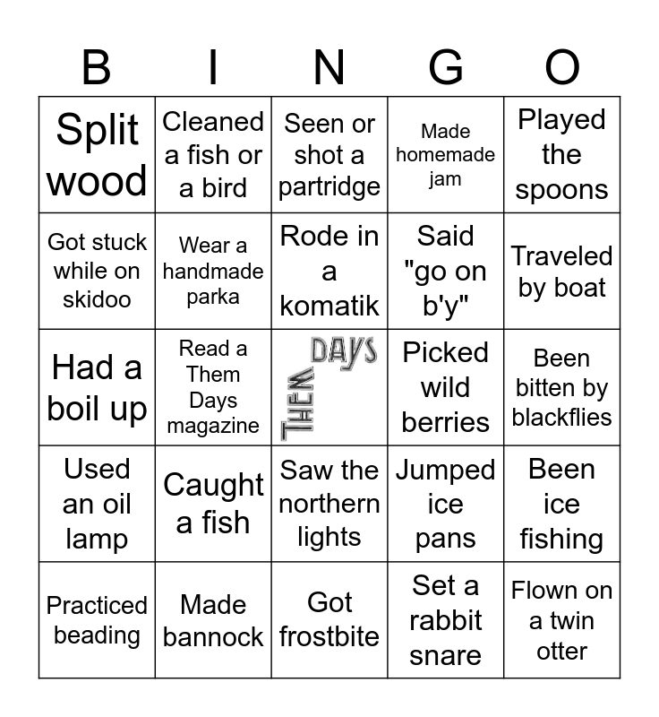 This bingo card has a free space and 24 words: Caught a fish, Made bannock, Rode in a komatik, Practiced beading, Played the spoons, Split wood, Got stuck while on skidoo, Cleaned a fish or a bird, Picked wild berries, Saw the northern lights, Said "go on b'y", Had a boil up, Jumped ice pans, Been ice fishing, Wear a handmade parka, Set a rabbit snare, Been bitten by blackflies, Seen or shot a partridge, Traveled by boat, Read a Them Days magazine, Flown on a twin otter, Used an oil lamp, Made homemade jam and Got frostbite.