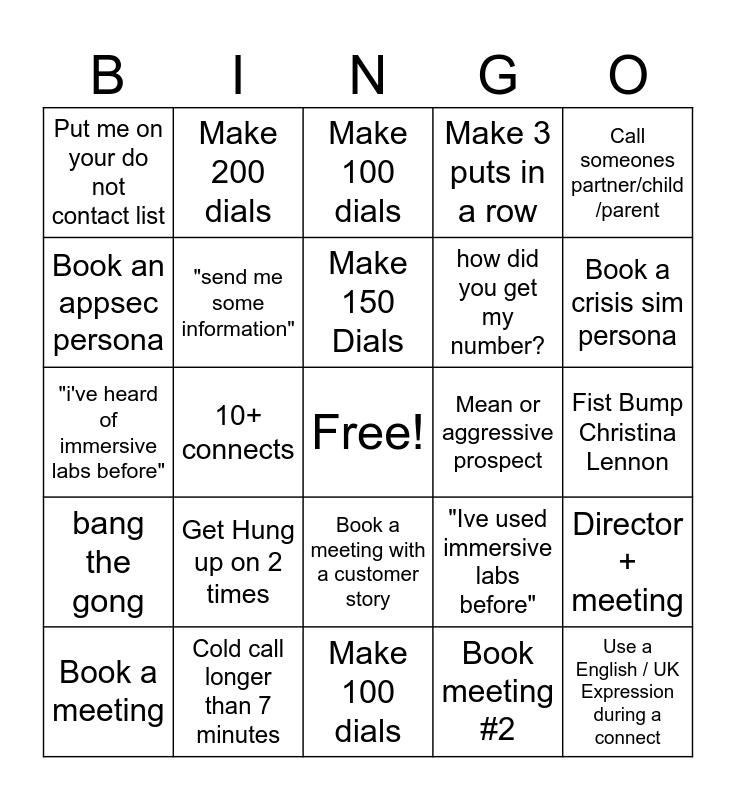 This bingo card has a free space and 24 words: Get Hung up on 2 times, Cold call longer than 7 minutes, Make 150 Dials, Book a meeting, Call someones partner/child /parent, Put me on your do not contact list, Book an appsec persona, Make 200 dials, Mean or aggressive prospect, Book a meeting with a customer story, how did you get my number?, "i've heard of immersive labs before", "Ive used immersive labs before", Director + meeting, "send me some information", Book meeting #2, Fist Bump Christina Lennon, Make 100 dials, Book a crisis sim persona, 10+ connects, Use a English / UK Expression during a connect, bang the gong, Make 3 puts in a row and Make 100 dials.