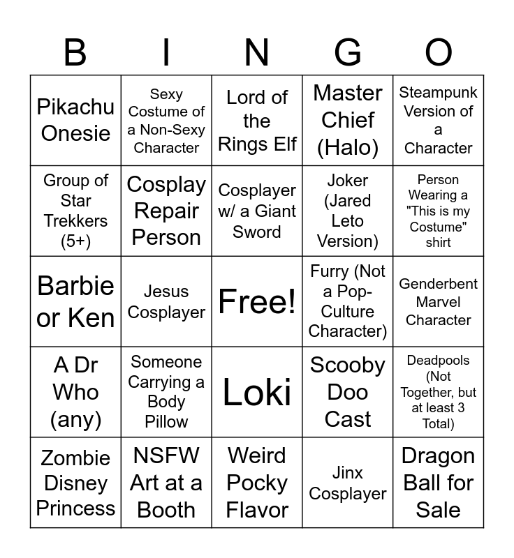 This bingo card has a free space and 24 words: Someone Carrying a Body Pillow, NSFW Art at a Booth, Cosplayer w/ a Giant Sword, Zombie Disney Princess, Steampunk Version of a Character, Pikachu Onesie, Group of Star Trekkers (5+), Sexy Costume of a Non-Sexy Character, Furry (Not a Pop-Culture Character), Loki, Joker (Jared Leto Version), Barbie or Ken, Scooby Doo Cast, Deadpools (Not Together, but at least 3 Total), Cosplay Repair Person, Jinx Cosplayer, Genderbent Marvel Character, Lord of the Rings Elf, Person Wearing a "This is my Costume" shirt, Jesus Cosplayer, Dragon Ball for Sale, A Dr Who (any), Master Chief (Halo) and Weird Pocky Flavor.