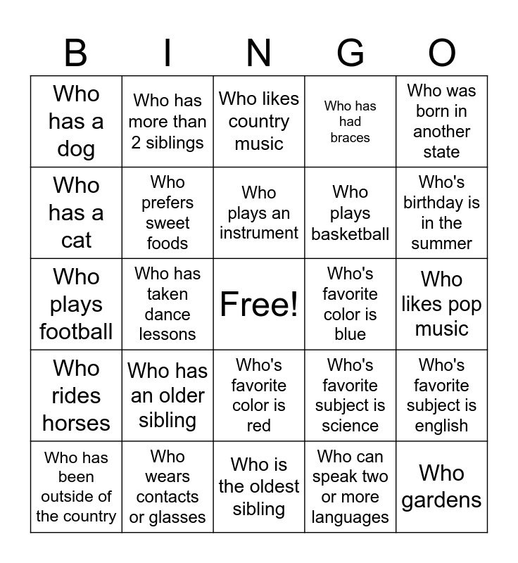 This bingo card has a free space and 25 words: Who has an older sibling, Who is the oldest sibling, Who plays an instrument, Who has been outside of the country, Who was born in another state, Who has a dog, Who has a cat, Who has more than 2 siblings, Who's favorite color is blue, Who's favorite color is red, Who plays basketball, Who plays football, Who's favorite subject is science, Who's favorite subject is english, Who prefers sweet foods, Who prefers salty foods, Who likes pop music, Who likes country music, Who's birthday is in the summer, Who has taken dance lessons, Who gardens, Who wears contacts or glasses, Who rides horses, Who has had braces and Who can speak two or more languages.