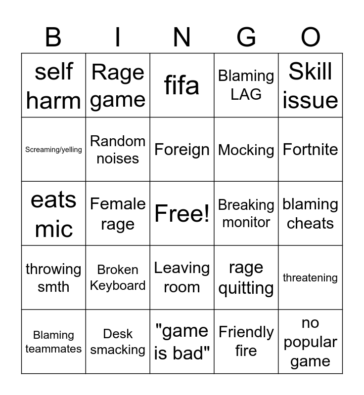 This bingo card has a free space and 24 words: Broken Keyboard, Desk smacking, Foreign, Blaming teammates, Skill issue, self harm, Screaming/yelling, Rage game, Breaking monitor, Leaving room, Mocking, eats mic, rage quitting, threatening, Random noises, Friendly fire, blaming cheats, fifa, Fortnite, Female rage, no popular game, throwing smth, Blaming LAG and "game is bad".