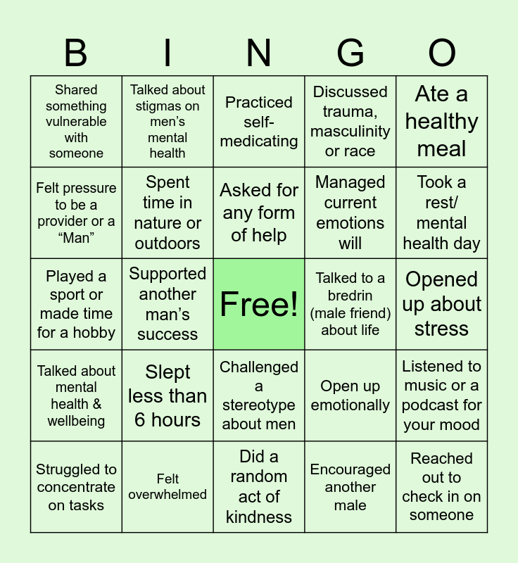 This bingo card has a free space and 24 words: Slept less than 6 hours, Felt overwhelmed, Asked for any form of help, Struggled to concentrate on tasks, Ate a healthy meal, Shared something vulnerable with someone, Felt pressure to be a provider or a “Man”, Talked about stigmas on men’s mental health, Talked to a bredrin (male friend) about life, Challenged a stereotype about men, Managed current emotions will, Played a sport or made time for a hobby, Open up emotionally, Listened to music or a podcast for your mood, Spent time in nature or outdoors, Encouraged another male, Opened up about stress, Practiced self-medicating, Took a rest/ mental health day, Supported another man’s success, Reached out to check in on someone, Talked about mental health & wellbeing, Discussed trauma, masculinity or race and Did a random act of kindness.
